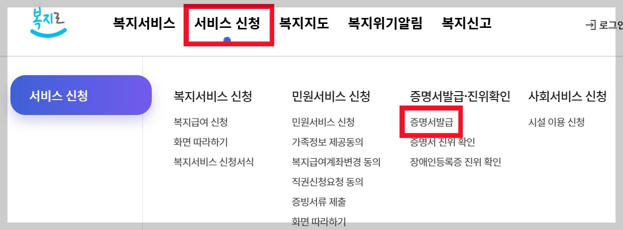 - ‘복지서비스 신청’ 탭 클릭 후 '확인서 발급’ 메뉴 진입