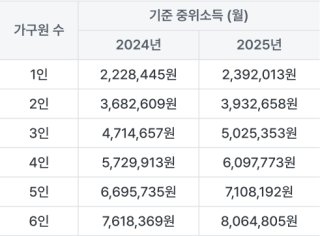 | 가구원수 | 기준 중위소득 50%(월소득) |